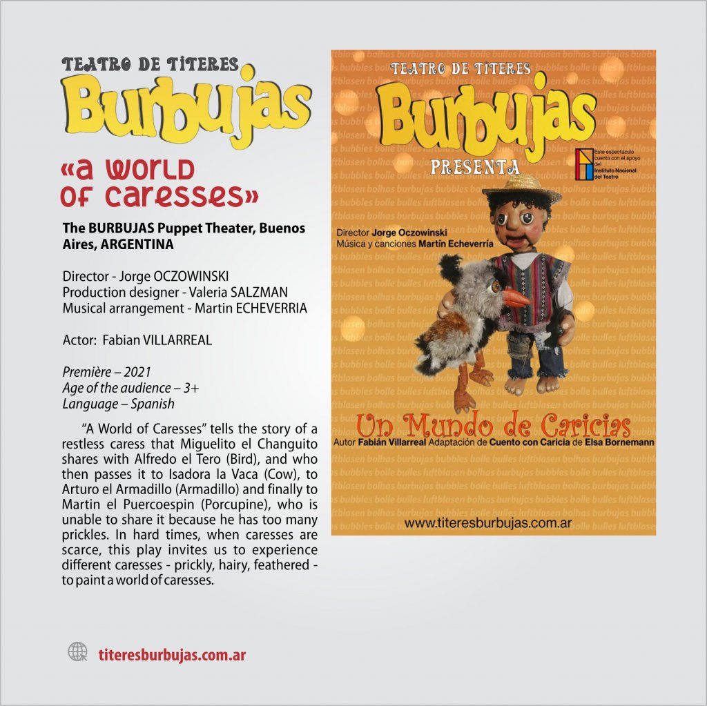 The BURBUJAS Puppet Theater, Buenos Aires, ARGENTINA Burbujas Puppet Theater was founded in 1993 by Fabian Villarreal, who received his professional education at the Escuela Nacional de Títeres de Rosario, Santa Fe, Argentina, where he received the title of Associate Professor of Puppet Theater Department. Now the theater’s team includes, in addition to Fabian, the director Jorge OCZOWINSKI and scenographer Valeria SALZMAN. The team performs in different cities in the southeast of Buenos Aires. The theater has participated in numerous national and international festivals in Argentina, as well as in Spain, Brazil, Poland, Colombia, Ukraine, Mexico, Chile and Turkey. The theater’s repertoire includes the following productions: “A World of Caresses"”, “The Flea Circus”, “The True Story of Zodo”, “The Blue Scarf”, “The Little Mouse Pérez”, “What Happened in the Kingdom of the Board”, “A Tale of a Little Time”, “Little Bug of light... without light”, “The Bull with Polka Dots” and others.