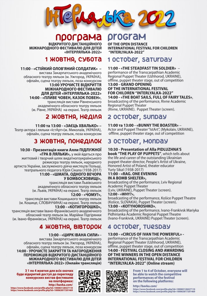 Виставою «ФЕДОРИНЕ ГОРЕ» Театру актора і ляльки «IстАрт» (м. Миколаїв, УКРАЇНА) завершуємо представлення учасників ВІДКРИТОГО ДИСТАНЦІЙНОГО МІЖНАРОДНОГО ФЕСТИВАЛЮ ДЛЯ ДІТЕЙ «ІНТЕРЛЯЛЬКА-2022»! А разом беруть участь 17 колективів: 10 українських та 7 закордонних. https://www.youtube.com/watch?v=TTVJifGa5Ps Театр актора і ляльки «IстАрт», м. Миколаїв, УКРАЇНА Миколаївський приватний театр ляльок «ІстАрт», що означає «Історії артистів» був створений 4 жовтня 2001 року акторською родиною Наталії та Вячеслава ГРИГОР'ЄВИХ. В репертуарі колективу 18 вистав. Театр ляльок «ІстАрт» брав участь у Міжнародних фестивалях «ПОДІЛЬСЬКА ЛЯЛЬКА» (м.Вінниця, Україна), «ІНТЕРЛЯЛЬКА» (м.Ужгород, Україна), «ЛАГАМІНАС» (м. Паневежис, Литва), «І ЛЮДИ, І ЛЯЛЬКИ» (м. Львів, Україна)