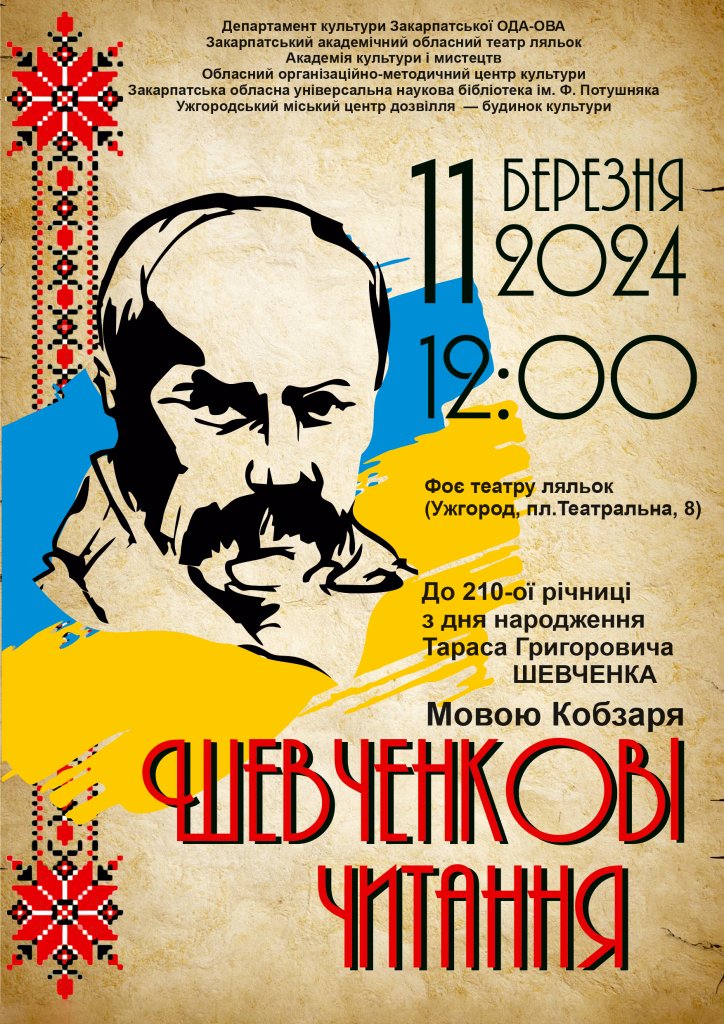У понеділок 11 березня з нагоди відзначення 210-ї річниці з дня народження Тараса Григоровича Шевченко у фоє Закарпатського академічного обласного театру ляльок відбувся поетичний марафон «ШЕВЧЕНКІВСЬКІ ЧИТАННЯ».